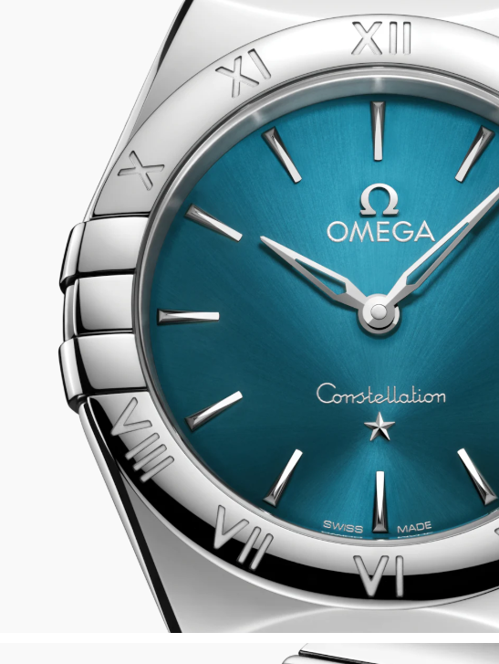 サンブラッシュ仕上げのピーコックブルーダイアルには
