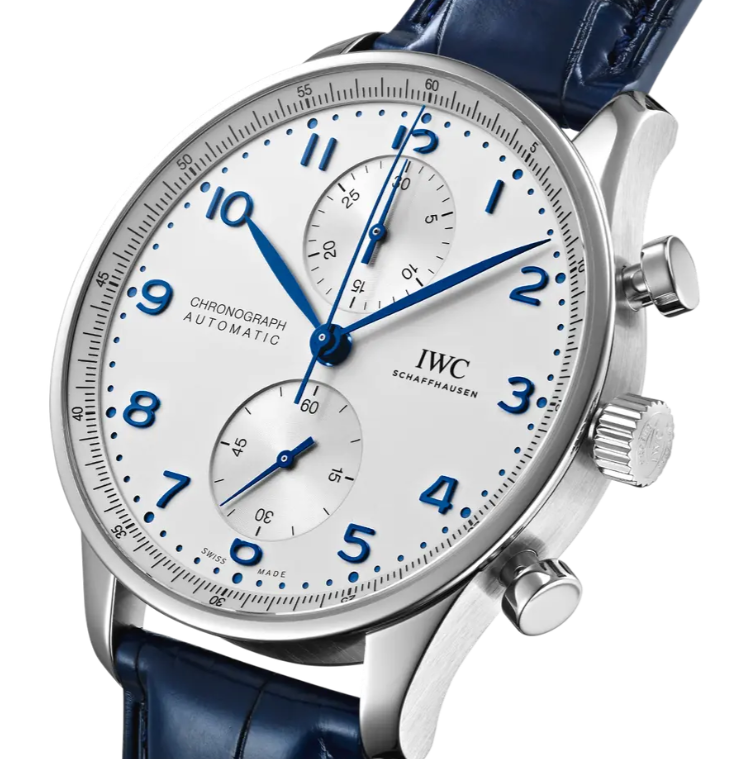 ポルトギーゼシリーズで最も人気の高いブルー針は、白い文字盤に上品にブルーが映え光の角度で色の濃さが変わります。