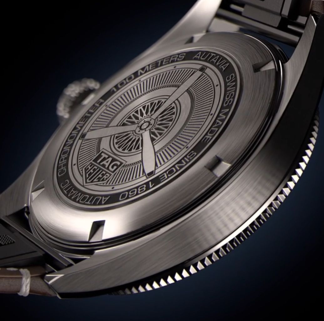 裏蓋にはモデル名の由来となる自動車と飛行機からそれぞれタイヤとプロペラのモチーフをデザイン![]()
