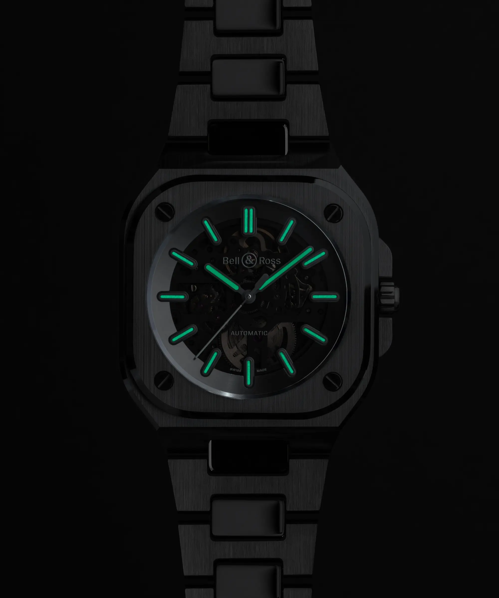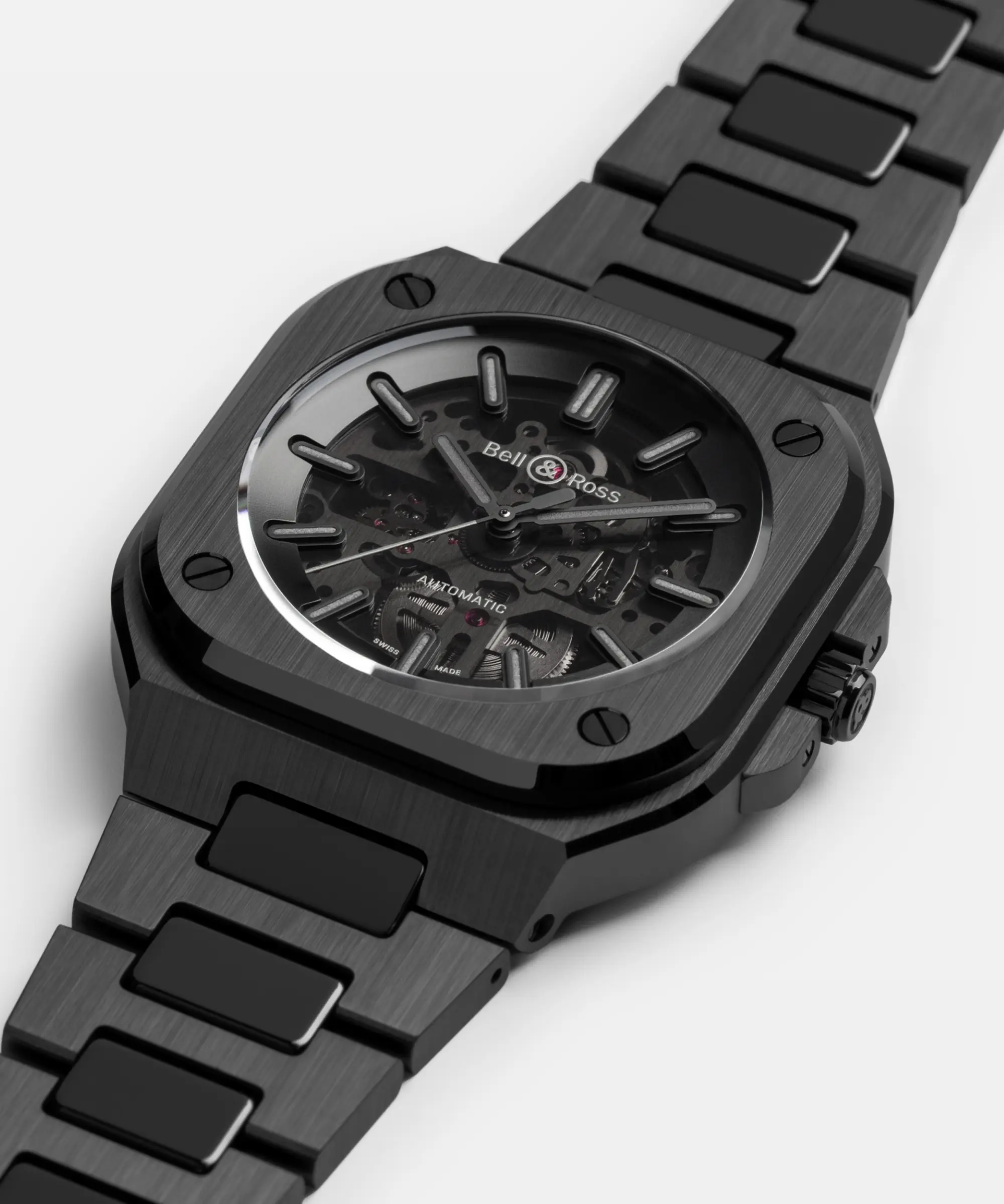 【世界限定500本】 BR-05 Skeleton Phantom Ceramicは卓越した技術とデザイン性を兼ね備えた、500本限定の特別モデルです。ブラックセラミック製のケースとブレスレットが、スケルトン構造のムーブメントを引き立てています。