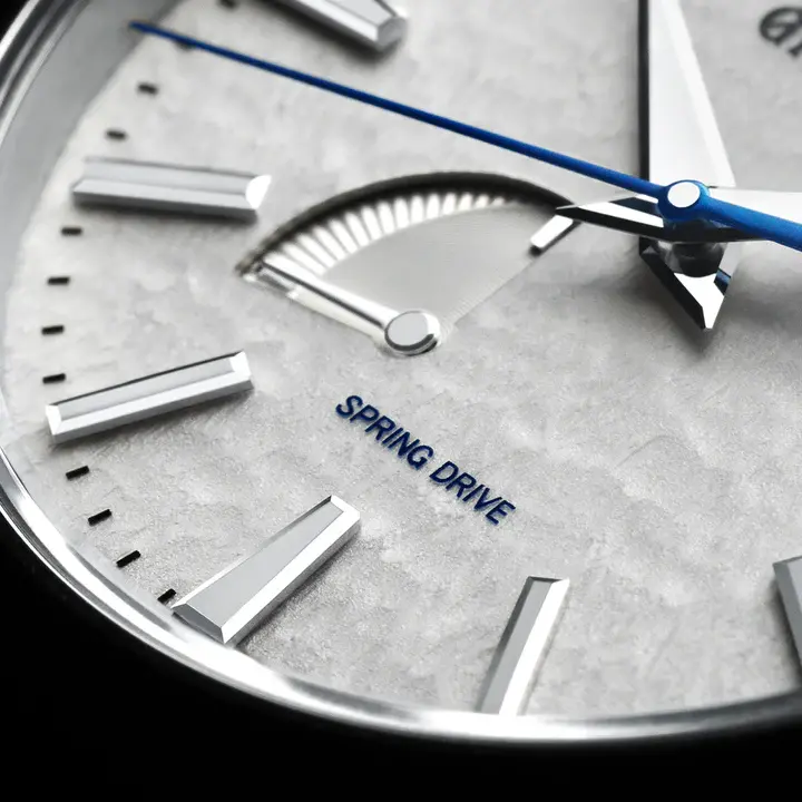 SBGA211純白のダイヤルに映えるブルースチールの秒針の動きは、独創の機構から生まれるスイープ運針で、白と青のコントラストがより一層、秒針の動きをドラマティックに演出しています。通称『雪白パターン』