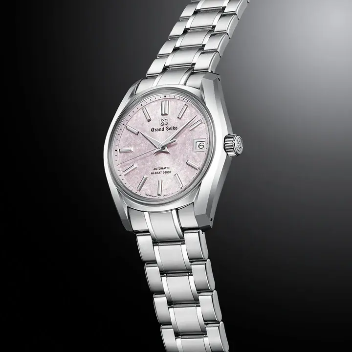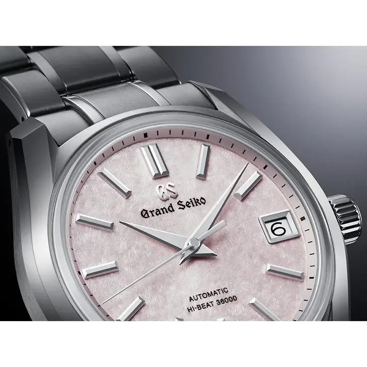 1967年に発売されたグランドセイコー史上初の自動巻メカニカルモデル「62GS」のデザインを現代的にアレンジし、日本特有の季節の移ろいをダイヤルに宿したモデルです。このモデルのダイヤルに表現されたのは、桜の花を雪が覆い隠す情景。桜と雪が共存する「桜隠し」と呼ばれる珍しいその現象は、グランドセイコーの機械式モデルの製造元「グランドセイコースタジオ 雫石」が位置する東北地方で春のはじまりに見られる美しい風景です。ムーブメントには毎秒 10 振動のハイビートムーブメント「キャリバー9S85」を搭載し、精度のばらつきを抑え、より安定した高精度を実現しています。ケース径38mmのサイズ感に加え、ケースとブレスレットには通常のチタンよりも傷つきにくく、白く美しいブライトチタンを採用し、心地よい装着感を創出しました。