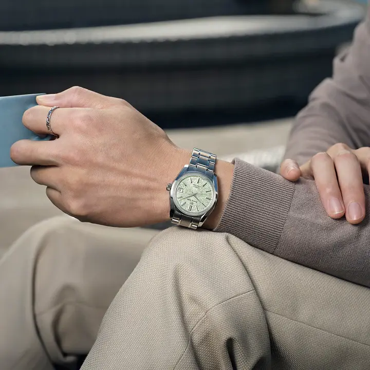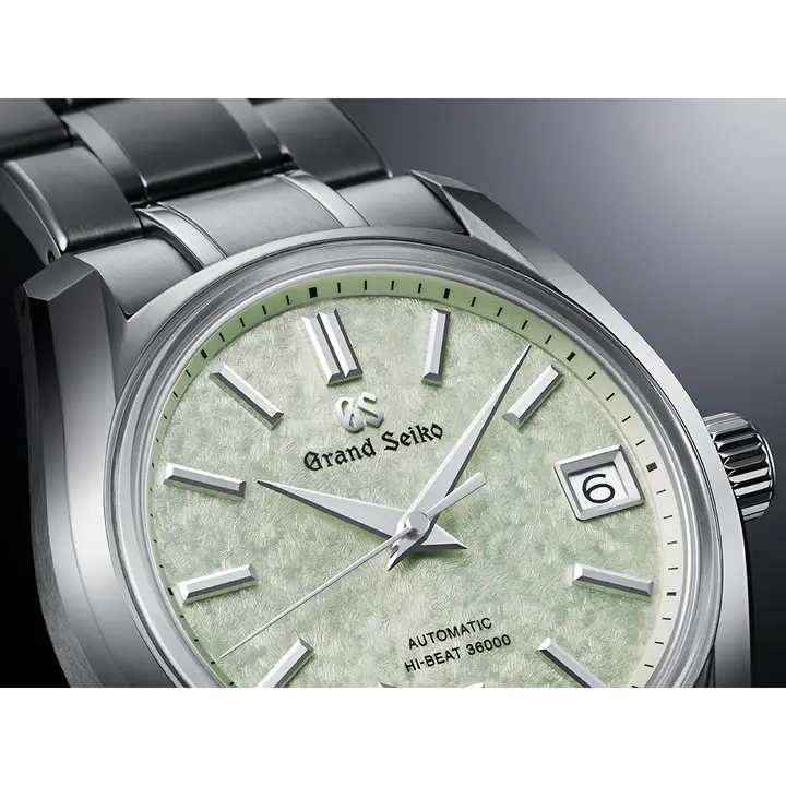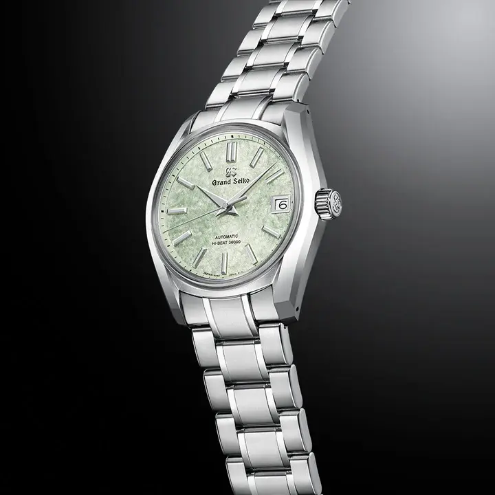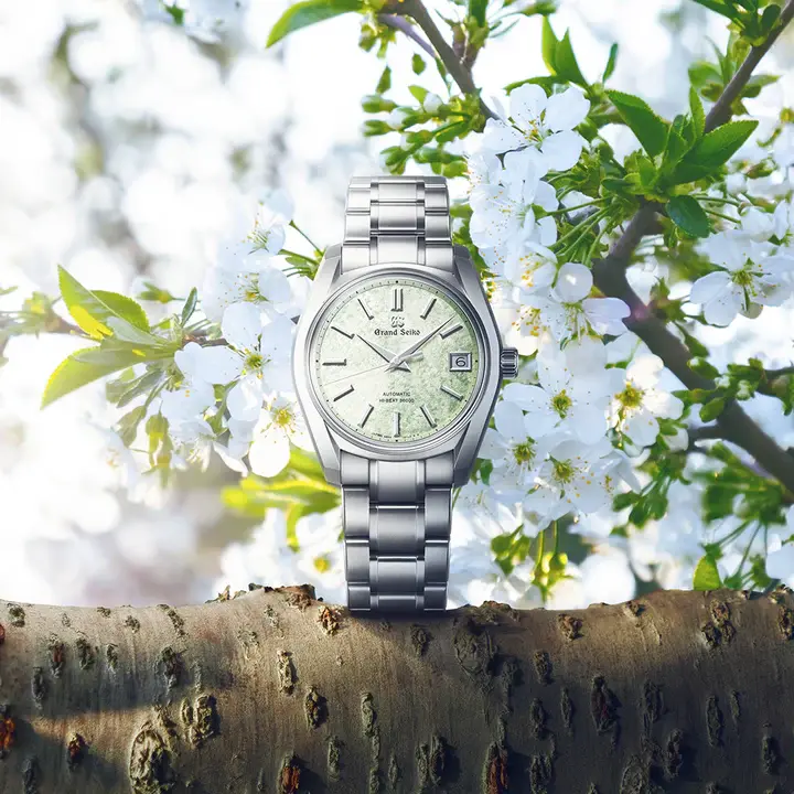 現代に至るまで継承されているブランド哲学「実用性の進化」を体現した傑作モデルとして名高いグランドセイコー初の自動巻メカニカルモデル「62GS」を、現代的解釈によってアレンジしたモデルです。ライトグリーンのダイヤルは、二十四節気の一つである春の「清明」の頃に芽吹く、桜の若葉をイメージ。薄桃色の桜の花びらの合間で陽の光を透かして光る若葉の瑞々しさを表現しました。ムーブメントには毎秒 10 振動のハイビートムーブメント「キャリバー9S85」を搭載し、精度のばらつきを抑え、より安定した高精度を実現。ケース径38mmのサイズ感に加え、ケースとブレスレットには通常のチタンよりも傷つきにくく、白く美しいブライトチタンを採用し、心地よい装着感を創出しました。