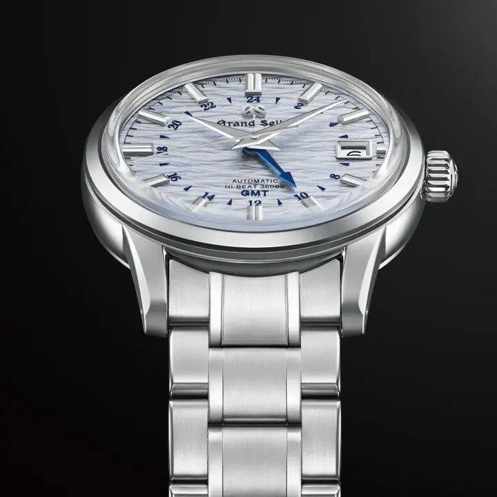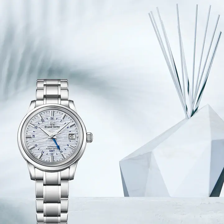 日本の四季がみせる豊かな表情をダイヤルに表現したGMTウオッチ。 二十四節気。1年を24等分して、季節の微妙な移ろいを日々の暮らしに取り入れてきた日本。そこから着想を得て、ダイヤルで一つの節気を美しく表現したGMTウオッチです。 梅雨が明け本格的な夏の到来を感じる小暑。 初夏の太陽のもと、爽やかな風で湖や池が揺らめく。梅雨明けに吹く「白南風(しらはえ)」によって起こる絶え間ないさざ波のイメージをダイヤルデザインに落とし込みました。「さざ波」のようなダイヤルパターンと10振動のハイビートムーブメントが生み出す力強い秒針の動きが響き合うモデルです。