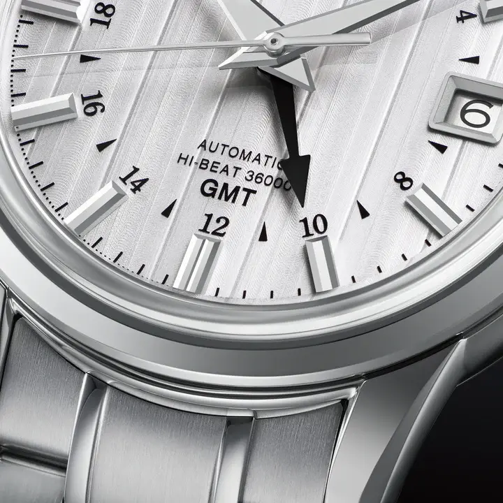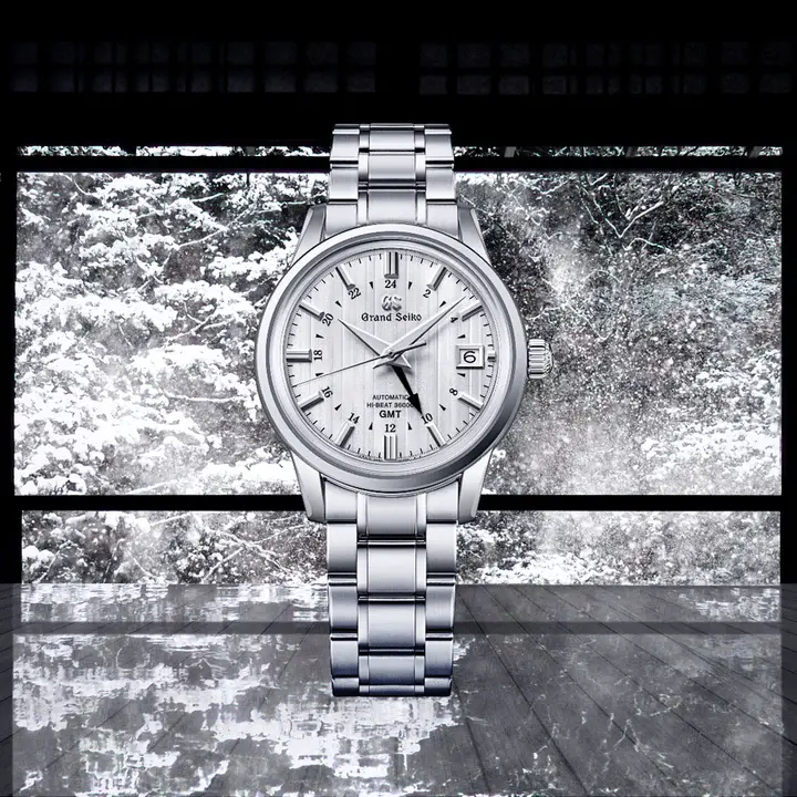 雪景色と伝統的な文化が織りなす情景をダイヤルに表現したGMTウオッチ。 春夏秋冬。その季節ならではの自然が織りなす趣を日々の暮らしに取り入れてきた日本。そこから着想を得て、自然と文化が共存する美しさをダイヤルで表現したGMTウオッチです。 日本の伝統的な家や寺院にみられる漆塗りの床。その光沢のある床に映り込む自然の移ろい。木々に積もる雪の風景が床に映り、まるで雪化粧したように床一面が白く輝く情景は「雪化床(ゆきげしょう)」と呼ばれています。 雪景色が映る床のようなダイヤルパターンと落ち着きのあるグレーのGMT針が相まって、日本の冬に見られる自然の趣が感じられるモデルです。