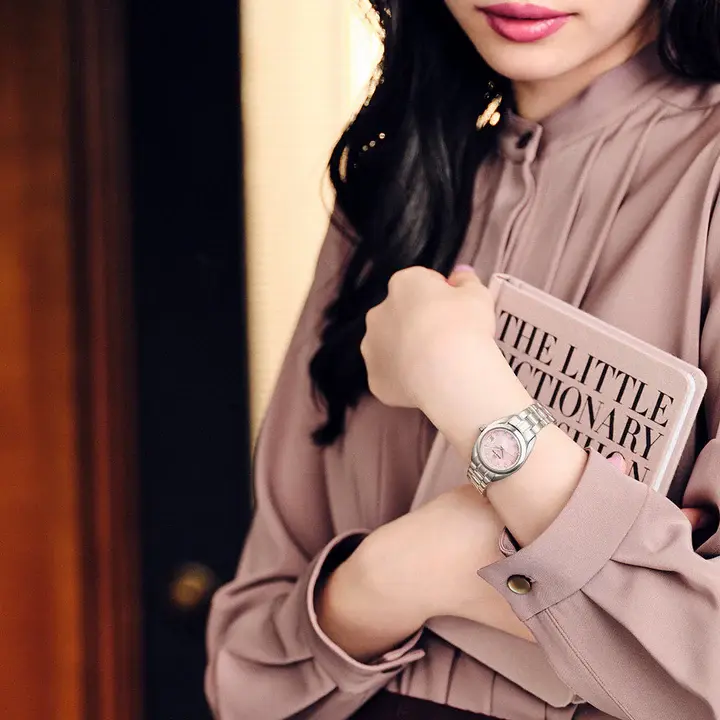 装いを選ばない小ぶりなサイズのレディス・クオーツモデル どんな装いにも合わせやすい、ケース幅26mmの小ぶりなサイズのレディス・クオーツモデルです。 ダイヤルに使用されているピンク色の白蝶貝は、しとやかな光を湛え、角度によってほのかに輝きを放ちます。 ダイヤカットを施した針やインデックスの煌めきは、美しさと視認性の調和がとれたダイヤルデザインをかなえています。 歪みのない美しい鏡面を広く取ったケースデザインが、上品な輝きを演出しています。