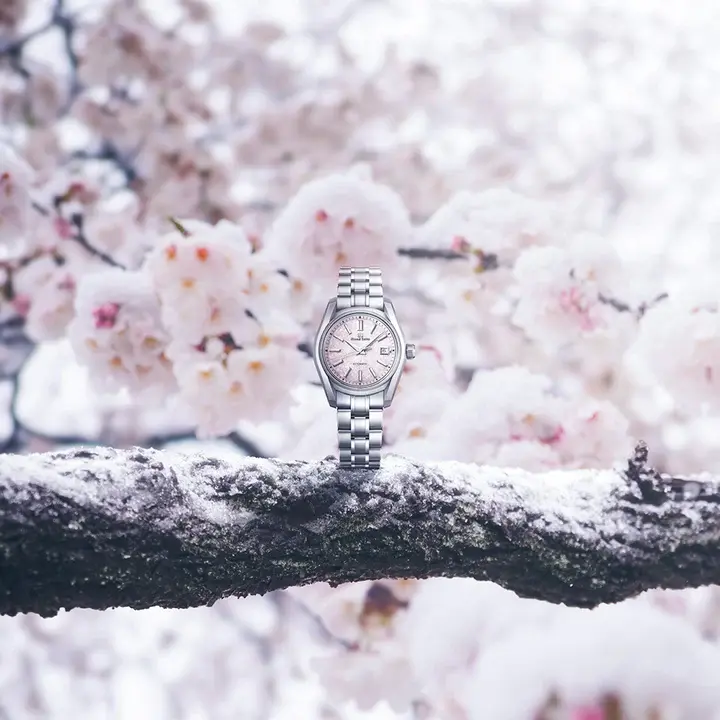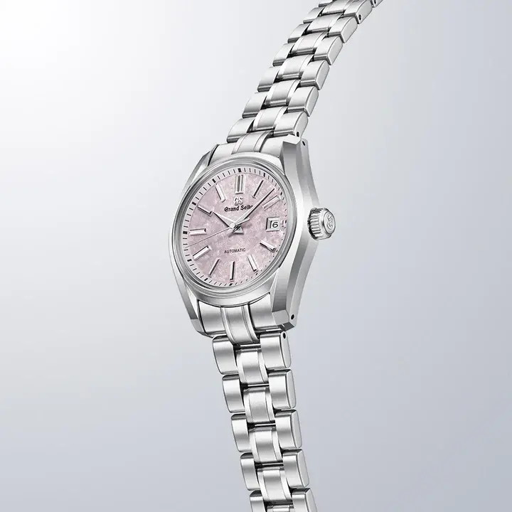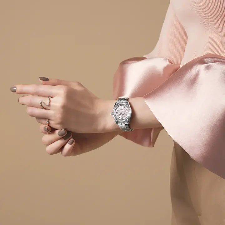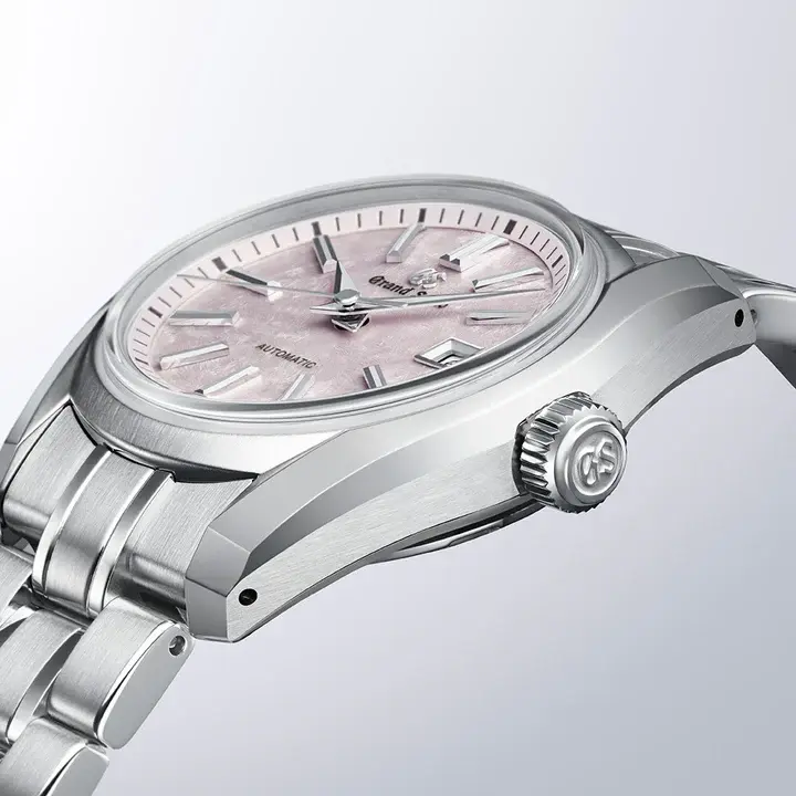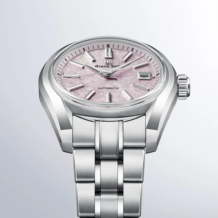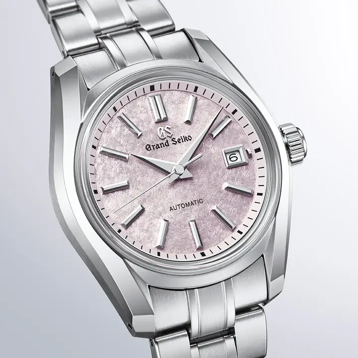 グランドセイコー初の自動巻メカニカルモデル「62GS」を現代的解釈によってアレンジし、日本特有の季節の移ろいをダイヤルに宿した小型メカニカルモデルが登場。「62GS」デザインは、ベゼル(ガラス縁)のない構造によって広々と見えるダイヤルや、「ザラツ研磨」によって実現したシャープな多面体からなるケースが特徴です。 ダイヤルは、桜の花を雪が覆い隠す「桜隠し」から着想を得ました。グランドセイコーのメカニカルモデルの製造を担う「グランドセイコースタジオ 雫石」が位置する東北地方で、春のはじまりに見られる風景です。雪と桜が共存する、春の儚く美しい情景を、繊細な型打ち模様とグレイッシュなピンク色で表現。