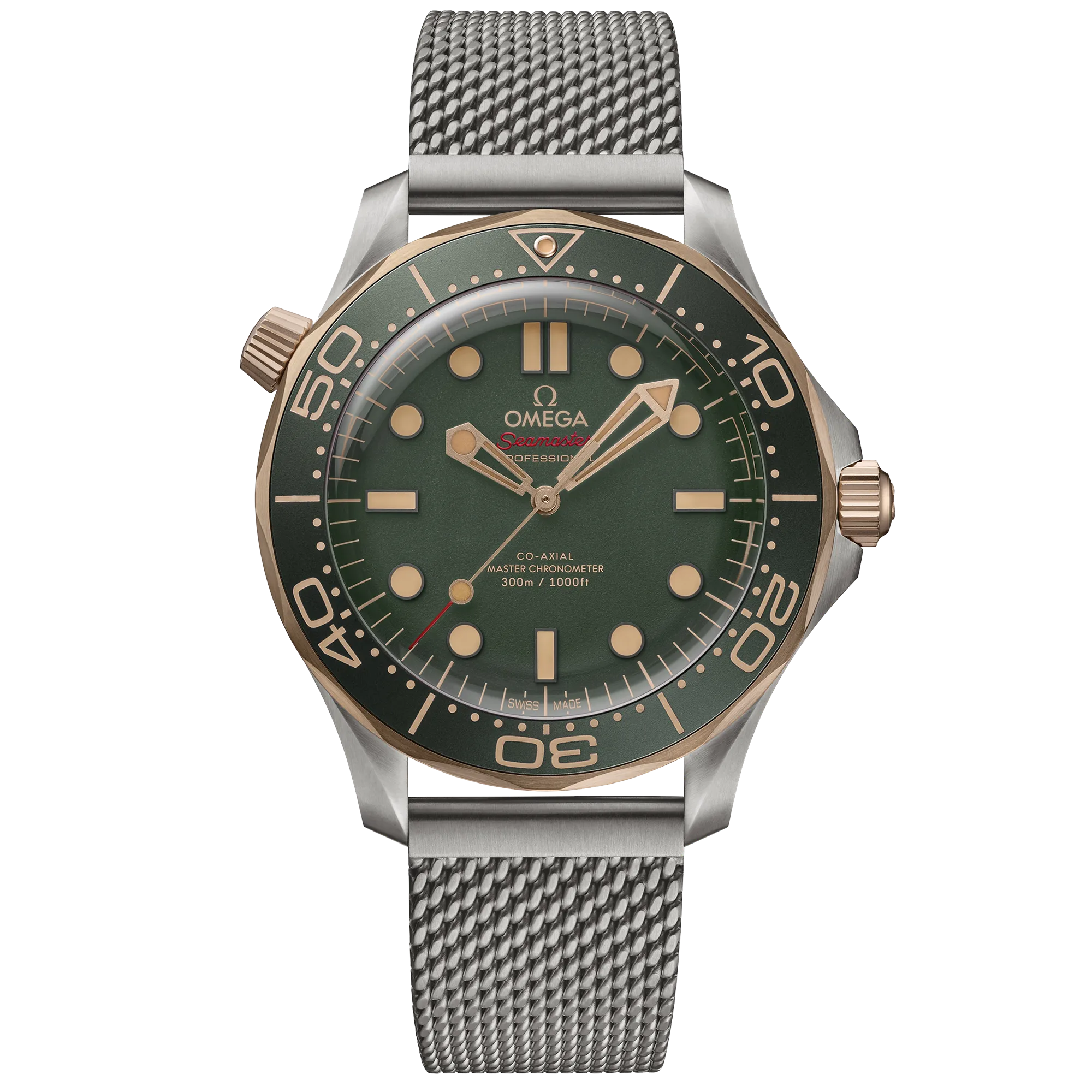 1993年の発売以来、伝説的な支持を誇る「シーマスター ダイバー300M」。現在のコレクションは、この有名な海との伝統の継承しつつ、オメガが誇る最先端の技術とデザインによってアップデートされています。 直径42mmのケースのモデルは、グレード2チタン&オメガ独自の9K ブロンズゴールド製です。シュウ酸アルマイト処理を施したグリーンのアルミニウム製ベゼルリングに、ヴィンテージのスーパールミノヴァが塗布されたダイビングスケールを備えています。 サンドブラスト加工のグリーンアルミニウムを使用したダイアルは、18KブロンズゴールドをPVDコーティングした針とブラックのインデックスを備え、そのすべてにヴィンテージスーパールミノヴァが施されています。オメガのロゴやその他のマーキングは、ライトブラウンとレッドの転写で施されています。 合わせられているのは、クラスプが付いたメッシュブレスレットです。オメガ コーアクシャル マスター クロノメーター キャリバー 8806搭載。波模様で縁どられたサファイアクリスタルガラスのケースバックからその姿を眺めることができます。