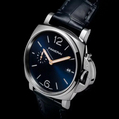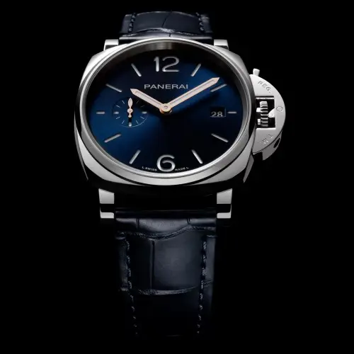 ブルー、サンブラッシュ仕上げ、夜光アラビア数字とアワーインデックス。3時位置に日付、9時位置にスモールセコンド