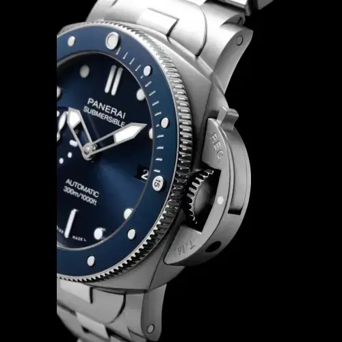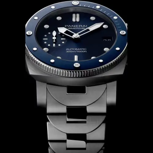 Blue sun-brushed with luminous hour markers and dots. Date at 3 o’clock, small seconds at 9 o’clock