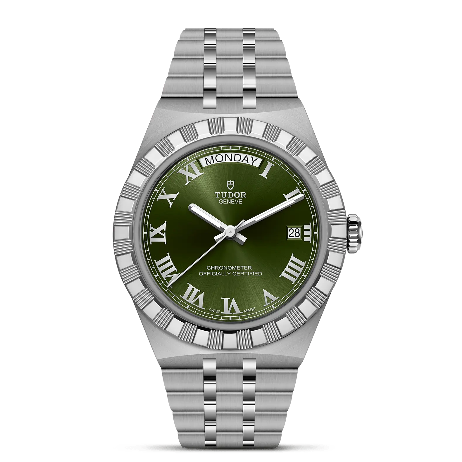 ブルーダイアル、ローマ数字のアプライド アワーマーカー 日付表示(3時位置) 曜日表示(12時位置)