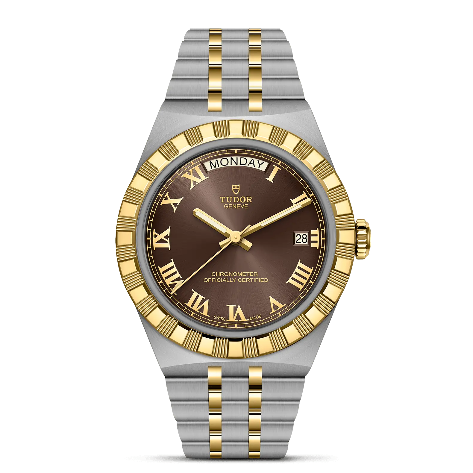 ブラウンダイアル、ローマ数字のアプライド アワーマーカー 日付表示(3時位置) 曜日表示(12時位置)